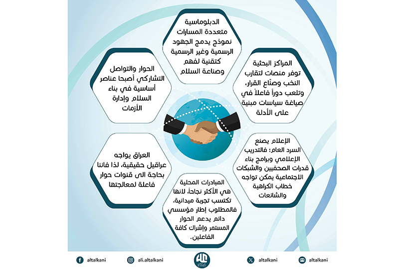 هذه التجارب، إلى جانب الأطر النظرية العالمية، تُظهر أن الحوار إضافة الى مهمته بأنه أداة تكميلية، أصبح أيضا ركيزة استراتيجية من ركائز الدبلوماسية الحديثة في بناء الاستقرار، فإن مراكز الفكر أصبحت جسورا تربط بين المعرفة وصناعة القرار، وتتيح فضاءات حوارية قائمة على البحث والتحليل.