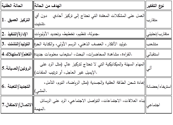 * المهام العقلية السبع: سيتعرف القارئ على الحالات العقلية السبع التي يمكن أن يعمل فيها عقلك، وكيفية مواءمة المهام مع كل حالة لزيادة الإنتاجية.