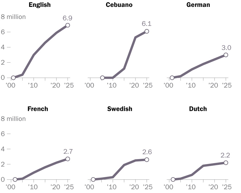 * السيبيوانية (Cebuano): قفزت بشكل هائل من 1.2 مليون في 2015 إلى 6.1 مليون في 2025 (بفضل الروبوتات).