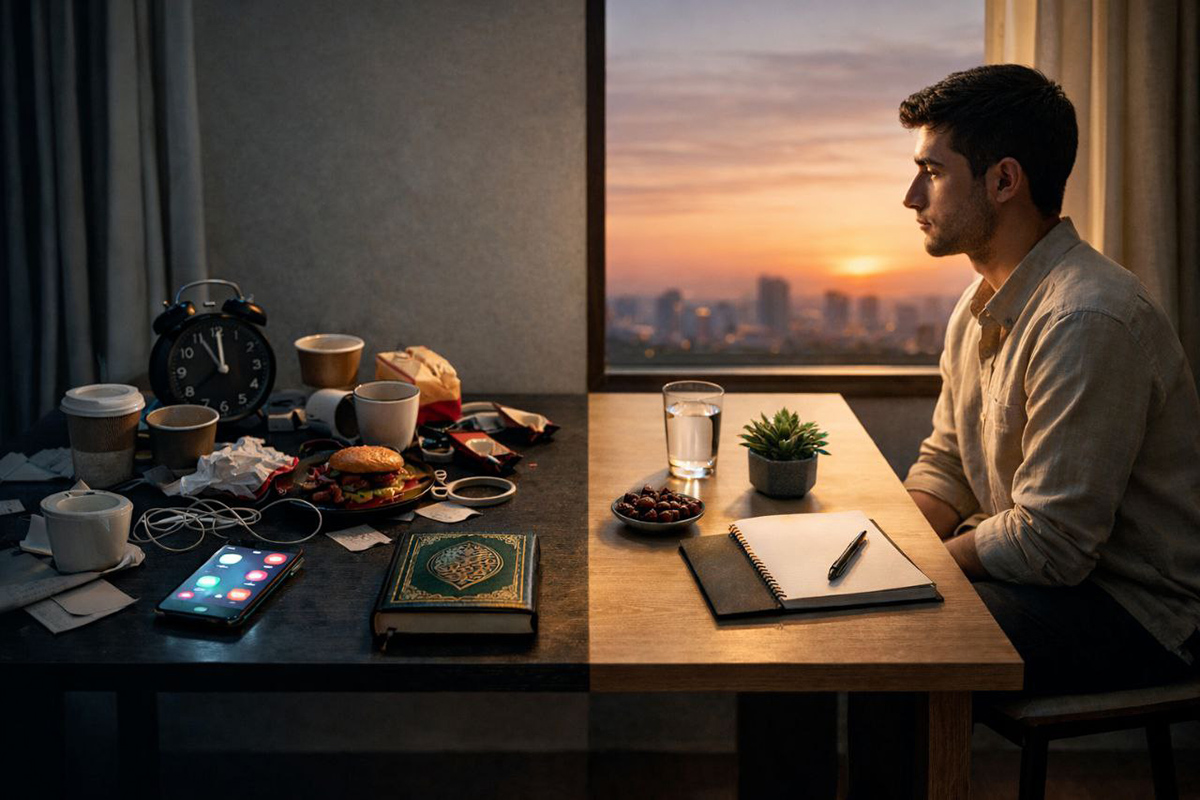 رمضان يأتي ليربك هذا النسق. فجأة، تتغير مواعيد النوم، يتقلص هامش الاستهلاك، ويفرض على الجسد والعقل نظام مختلف. هنا تحديدًا تكمن الفرصة إما أن نعيد إنتاج العادات نفسها بشكل آخر، أو أن نستثمر هذا الارتباك الإيجابي لكسرها من الجذور.
