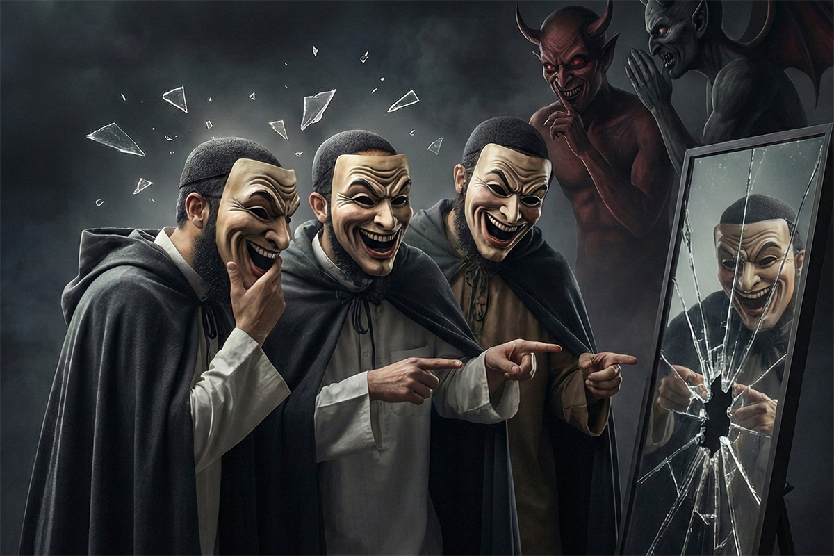 يقول الله تعالى: {إِنَّ الَّذِينَ أَجْرَمُوا كَانُوا مِنَ الَّذِينَ آمَنُوا يَضْحَكُونَ *وَإِذَا مَرُّوا بِهِمْ يَتَغَامَزُونَ *وَإِذَا انْقَلَبُوا إِلَى أَهْلِهِمُ انْقَلَبُوا فَكِهِينَ *وَإِذَا رَأَوْهُمْ قَالُوا إِنَّ هَؤُلاَءِ لَضَآلُّونَ}(23).
