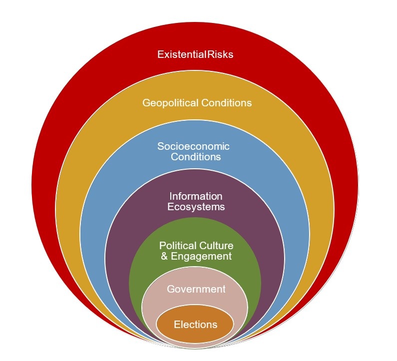 بالو ألتو ــ بدأ الذكاء الاصطناعي يؤثر بالفعل على ركائز الحكم الديمقراطي في مختلف أنحاء العالم. ومن الممكن رسم خريطة لتأثيراته على هيئة دوائر متحدة المركز تمتد إلى الخارج من الانتخابات مرورا بتبني الحكم؛ والمشاركة السياسية، وثقة الجمهور، وأنظمة المعلومات الإيكولوجية، ثم إلى المخاطر الجهازية في عموم الأمر ــ الصدمات الاقتصادية، والمنافسة الجيوسياسية، والمخاطر التي "تهدد وجودنا" مثل المناخ أو الأسلحة البيولوجية. وكل دائرة تقدم فرصا وتحديات على حد سواء.