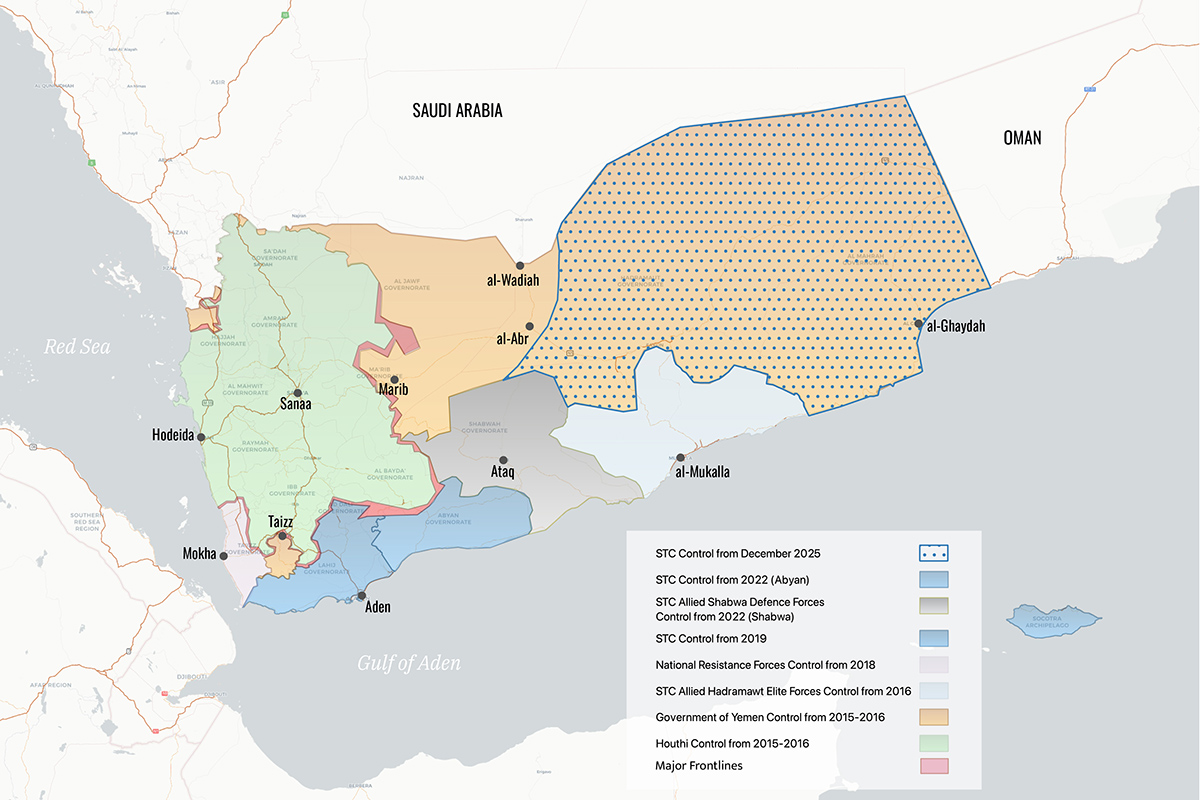 شهد الوضع في اليمن تحولاً دراماتيكياً هذا الشهر عندما استولت قوات انفصالية جنوبية متحالفة مع الإمارات العربية المتحدة بسرعة على محافظتين كبيرتين تشكلان ما يقرب من نصف مساحة البلاد: منطقة حضرموت المنتجة للنفط التي تحدّ السعودية، والمهرة التي تحدّ عُمان. يمنح هذا الهجوم "المجلس الانتقالي الجنوبي" - الذي كان جزءاً غير مريح من الحكومة المعترف بها دولياً لمدة ثلاث سنوات - سيطرة فعلية على معظم "اليمن الجنوبي" السابق، وهي دولة مستقلة قبل عام 1990. كما يقرّب المجموعة خطوة واحدة من هدفها المتمثل في الاستقلال.