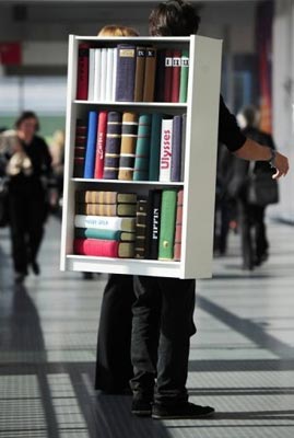 رجل يحمل على ظهره مجسما يمثل مكتبة