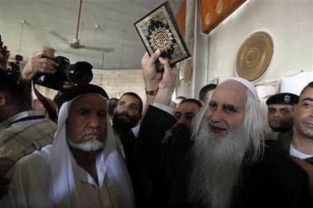 يرفع مصحفا لدى تسليمه للفلسطينيين في مسجد بقرية في الضفة الغربية بعد