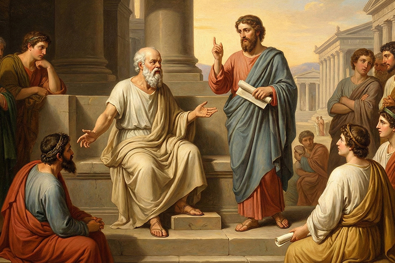 سقراط لم يترك كتاباً واحداً، لأن الحقيقة عنده لا توجد إلا في الحوار الحيّ، في الولادة المشتركة. يقول لثياتيتوس: «أنا لا أعرف شيئاً، لكني أجعل الآخرين يلدون ما في أنفسهم».