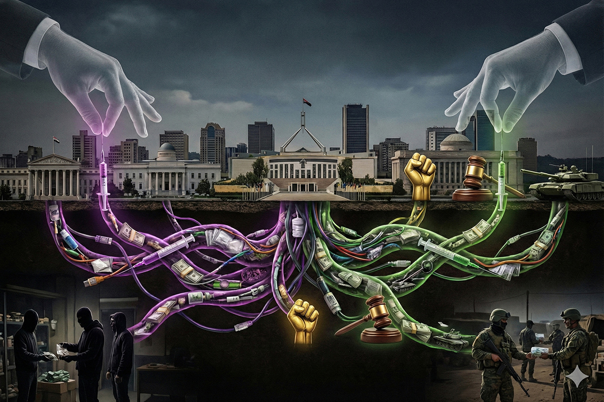 ولنتذكر في هذا السياق، المسارات المعقدة لتهريب الأفيون من آسيا أو الكوكايين من أمريكا اللاتينية عبر مناطق العبور غرب إفريقيا والبلقان، في تحدٍ دائم وسافرٍ لأليات الرقابة الحدودية التي أجبرت تلك الدول في اكثر من مناسبة واتفاقية على التنازل عن جزءٍ من سيادتها للتعاون الأمني الأجنبي في مواجهة هذه التجارة التي تحولت بفعل أموالها وشبكة علاقاتها الواسعة الى معول هدمٍ لهيبة الدولة ومؤسسات حفظ النظام والقانون واضعافها او اغراق المسؤولين فيها (أي تلك المؤسسات) بالفساد في سبيل اخضاعهم لتحكم تلك المافيات؛ حتى تتحول أجزاء من الدولة ومؤسساتها إلى "دولة مفسدة داخل الدولة".