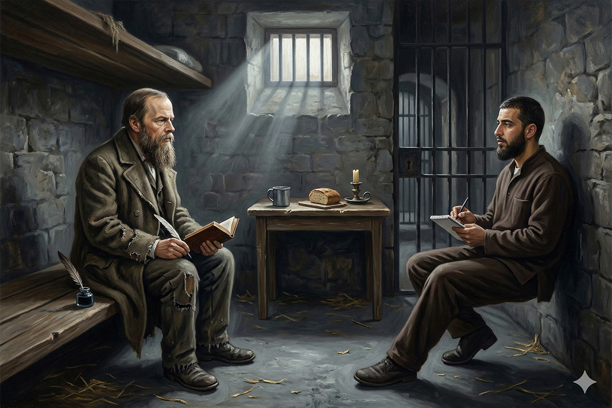 أمَّا عِند دوستويفسكي، فإنَّ السِّجْنَ يتحوَّل إلى مُخْتَبَر نَفْسي وفلسفي. العُقوبةُ الجسدية تُصبح وسيلةً للكشفِ عن أعماقِ النَّفْسِ البشرية، والصِّراعِ بين الخَيْرِ والشَّر، والصِّدامِ بَين الإيمانِ واليأس، والمُواجَهةِ بين الرَّغبةِ في الحياةِ والخَوْفِ مِن المَوْتِ الرمزي. التِّجْرِبةُ السِّجْنيةُ عِنده لَيست حادثةً حياتيةً فَحَسْب، بَلْ أيضًا تَجْرِبة وجودية عميقة تهزُّ القِيَمَ والمُعْتَقَدَات، وتضعُ الإنسانَ أمامَ ذَاتِه الصافية، بلا أيِّ سِتارٍ أوْ مُوَارَبَة.
