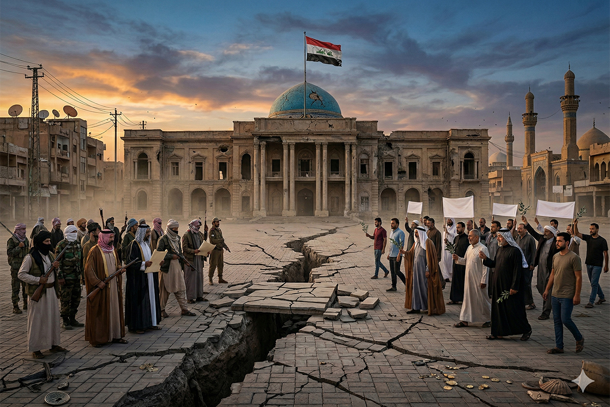 ثانياً: السيادة السائلة وفقدان الاحتكار القهري: تذهب الرؤية الفيبرية الكلاسيكية الى ان الدولة هي الجهاز الذي يحتكر العنف المشروع، لكن في العراق تآكل هذا الاحتكار لصالح نموذج الدولة الهشة القائم على سيادة الهوية المكوناتية والإقطاعيات السياسية، السيادة هنا أصبحت سائلة تذوب حسب أهداف القوة التقليدية المكوناتية الممسك بالهيكل الوظيفي، مما أدى إلى غياب العقل الوظيفي الاستراتيجي الوطني المركزي.