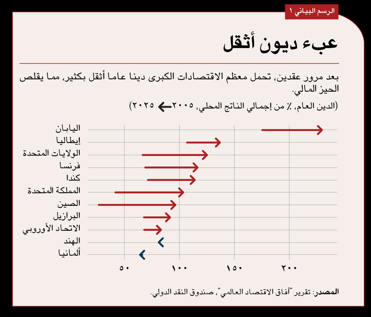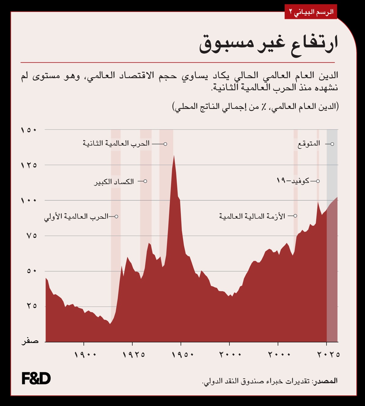 واليوم، يواجه صناع السياسات أزمة في المالية العامة مماثلة لأزمة كوفيد طويلة الأمد - ارتفاع أسعار الفائدة وتزايد تكاليف الديون. فقد ارتفع الدين العام العالمي إلى 93,9% من إجمالي الناتج المحلي في عام 2025 وهو في سبيل الوصول إلى أكثر من 100% بحلول عام 2028 –وتلك مستويات غير مسبوقة في وقت السلم– مما يمثل نقطة تحول للسياسة الاقتصادية والسياسة. وفي الوقت ذاته، نجد أن القوى الهيكلية طويلة الأمد – مثل شيخوخة السكان وتغير المناخ وزيادة المطالب الاجتماعية، وكذلك تراجع تدفقات المعونة والارتفاع المستمر في تكاليف الاقتراض في حالة البلدان منخفضة الدخل – مستمرة في استنزاف الميزانيات بينما تمارس التوترات الجغرافية-السياسية الناشئة ضغوطا على الإنفاق على الدفاع والسياسة الصناعية.