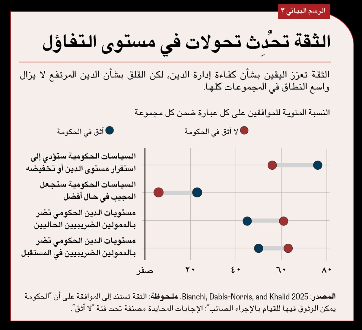 وفي غياب الثقة، يزداد التشاؤم بشأن سياسات الحكومة. فاحتمالية الاعتقاد بأن سياسات الحكومة ستساعد على استقرار الدين العام أو تخفيضه تزيد بنسبة 20% في حالة المجيبين على المسح الذين أعربوا عن ثقة أكبر في حكوماتهم. ورغم أن المجيبين يميلون إلى الشك بوجه عام في أن سياسات خفض الدين الحالية ستُحسن أوضاعهم، فإن احتمالية توقع أثر إيجابي على رفاهيتهم تزيد بنسبة 17% في حالة المجيبين الأكثر ثقة في الحكومة.