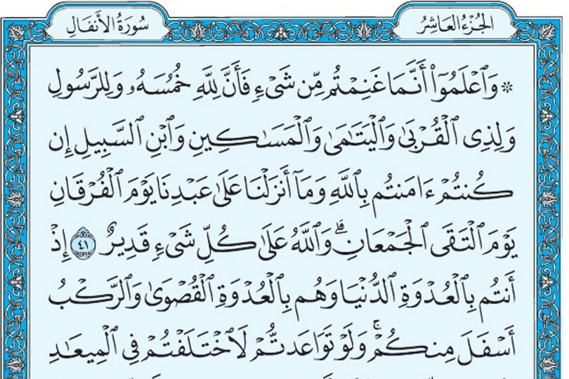 العالِم (بهيبةٍ وجلال): يقول الله (تعالى) في سورة الأنفال: (وَاعْلَمُوا أَنَّمَا غَنِمْتُم مِّن شَيْءٍ فَأَنَّ لِلَّهِ خُمُسَهُ وَلِلرَّسُولِ وَلِذِي الْقُرْبَىٰ وَالْيَتَامَىٰ وَالْمَسَاكِينِ وَابْنِ السَّبِيلِ إِن كُنتُمْ آمَنتُم بِاللَّهِ وَمَا أَنزَلْنَا عَلَىٰ عَبْدِنَا يَوْمَ الْفُرْقَانِ يَوْمَ الْتَقَى الْجَمْعَانِ وَاللَّهُ عَلَىٰ كُلِّ شَيْءٍ قَدِيرٌ) (3).