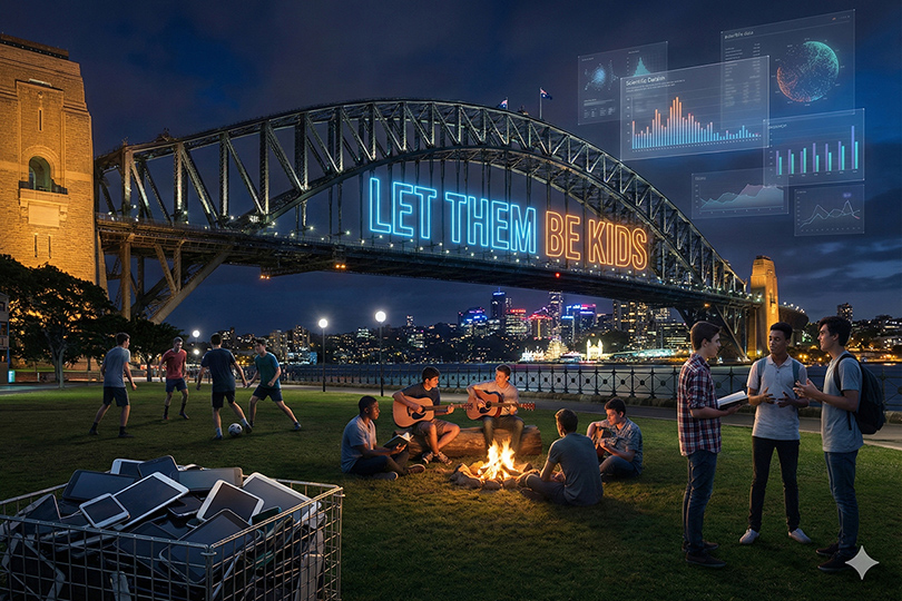 احتفالاً ببدء سريان الحظر الوطني على وسائل التواصل الاجتماعي للأطفال دون سن 16 عاماً، أضاءت الحكومة الأسترالية "جسر هاربر" في سيدني بشعار: "دعوهم يعيشوا طفولتهم".